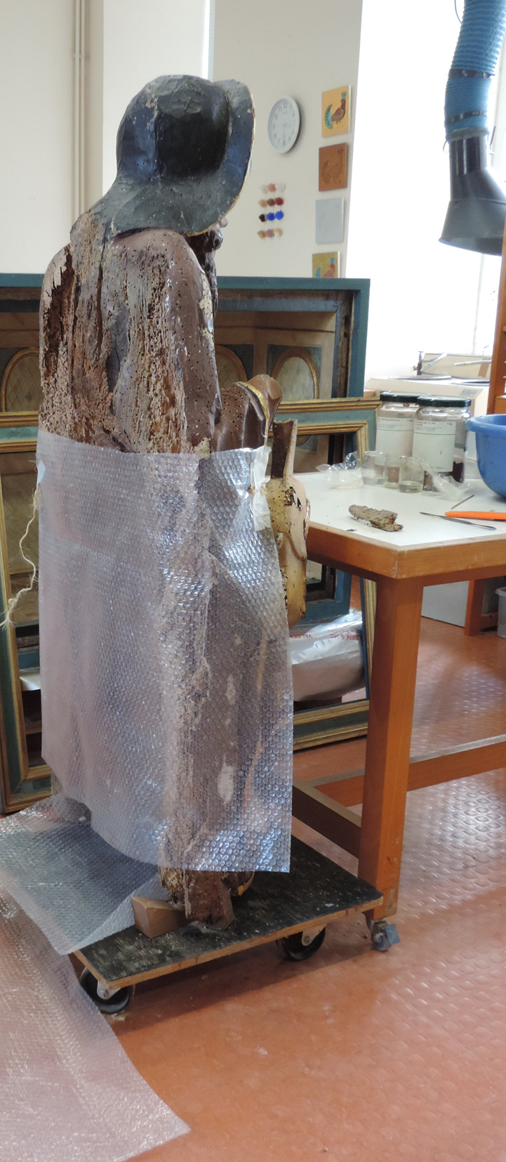 Compte tenu de l’aspect du devant de la statue, déjà bien abîmée (nombreux trous d’envol d’insectes xylophages) et de son emplacement en hauteur sur une console de granit, il a fallu utiliser un échafaudage - visible sur la photo 1- pour opérer avec un minimum de risques de dégradations supplémentaires.